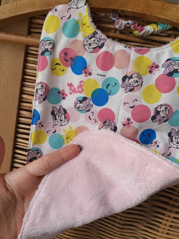 une face en coton imprimé "Minnie" et une face en éponge de bambou rose pale (tout doux).